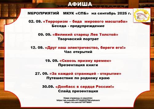 Афиша Уважаемые подписчики и гости нашей страницы предлагаем вашему вниманию афишу мероприятий МКУК "СПБ" на сентябрь 2025 года.