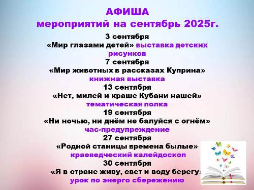 Афиша Уважаемые подписчики и гости нашей страницы предлагаем вашему вниманию афишу мероприятий филиала №1 МКУК "СПБ" на сентябрь 2025 года.
