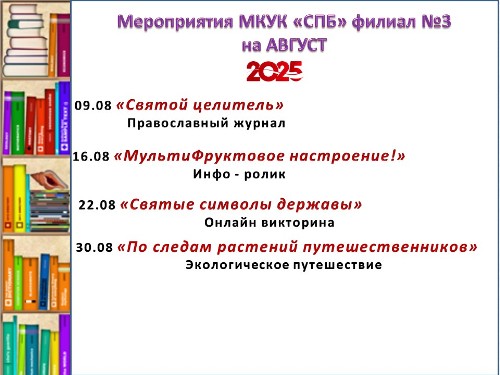 Афиша Уважаемые подписчики и гости нашей страницы предлагаем вашему вниманию афишу мероприятий филиала №3 МКУК "СПБ" на август 2025 года.