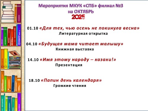 Афиша Уважаемые подписчики и гости нашей страницы предлагаем вашему вниманию афишу мероприятий филиала №3 МКУК "СПБ" на октябрь 2025 года. |