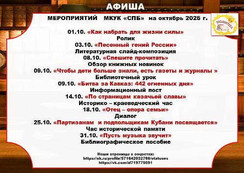 Афиша Уважаемые подписчики и гости нашей страницы предлагаем вашему вниманию афишу мероприятий МКУК "СПБ" на октябрь 2025 года.