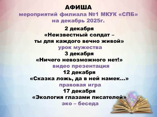 Уважаемые подписчики и гости нашей страницы предлагаем вашему вниманию афишу мероприятий МКУК "СПБ" филиал № 1 на декабрь 2025 года.  |