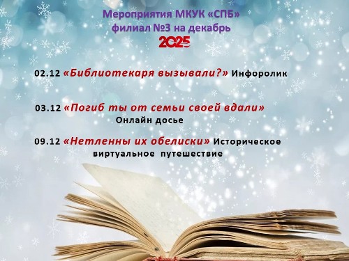 Афиша Уважаемые подписчики и гости нашей страницы предлагаем вашему вниманию афишу мероприятий МКУК "СПБ" филиал № 3 на декабрь 2025 года.