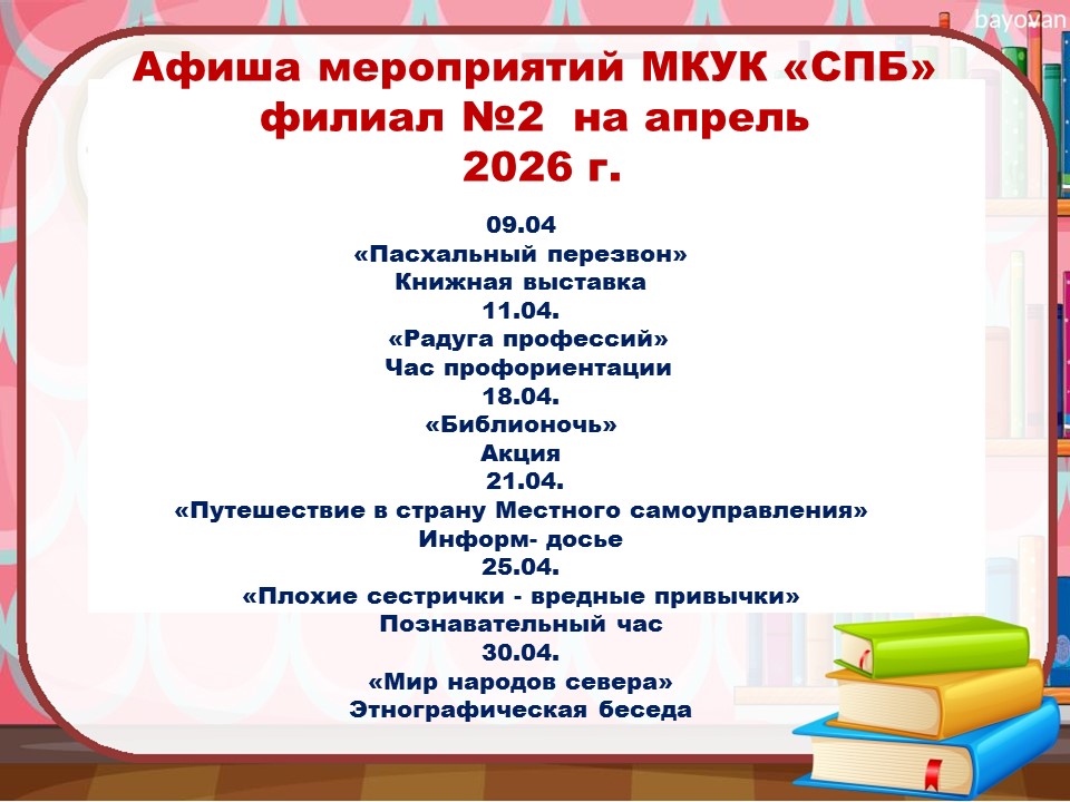 Афиша Уважаемые подписчики и гости нашей страницы предлагаем вашему вниманию афишу мероприятий МКУК "СПБ" филиал № 2 на апрель 2026 года.