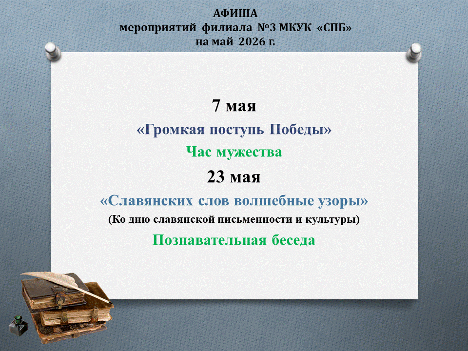 Афиша Уважаемые подписчики и гости нашей страницы предлагаем вашему вниманию афишу мероприятий МКУК "СПБ" филиал № 3 на май 2026 года.  |