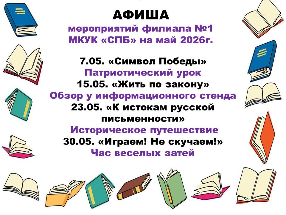 Афиша Уважаемые подписчики и гости нашей страницы предлагаем вашему вниманию афишу мероприятий МКУК "СПБ" филиал № 1 на май 2026 года.  |